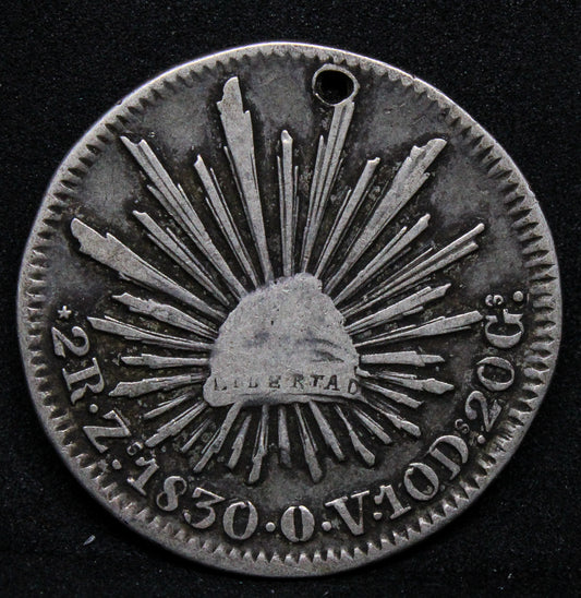 1830 2 Reales Zs-OV ( Zacatecas Mint), Mexico Silver coin. KM-374.12, Holed