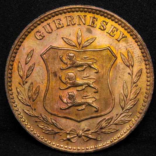 8 Doubles 1910 -H, Guernsey Bronze Coin. KM-7. BU + colour/Lustre