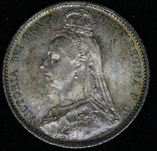 1887 withdrawn 6 pence six pence Victoria UNC, rainbow Toning on Rev