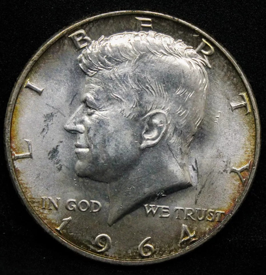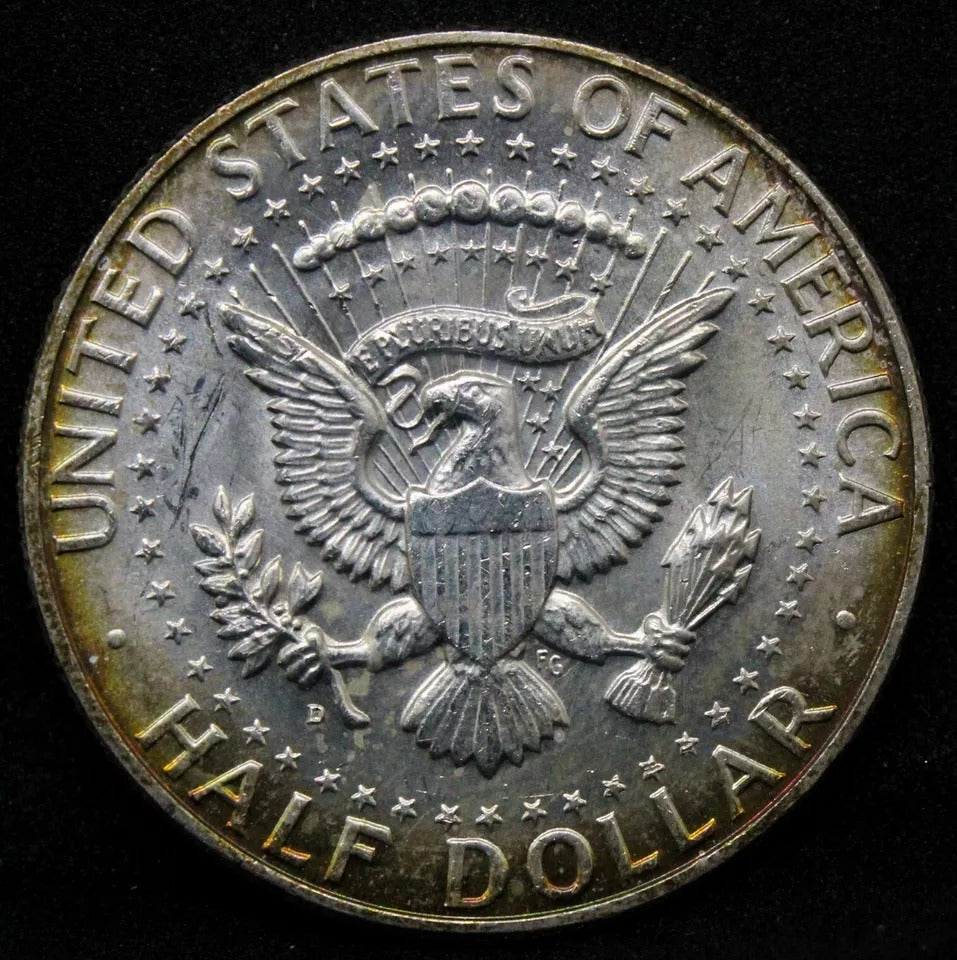 1/2 Dollar 1964-D, Kennedy . UNC with golden toning. (half $)