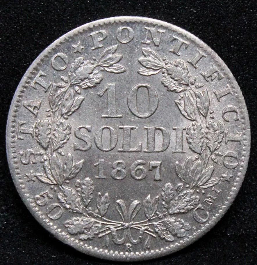 1867-R 10 Soldi, Pope Pius IX, Papal States. KM-1376. UNC