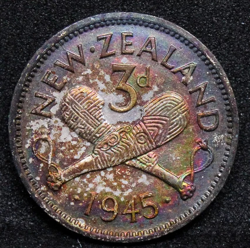 1945 Three Pence George VI New Zealand UNC KM-1, Colourful tones